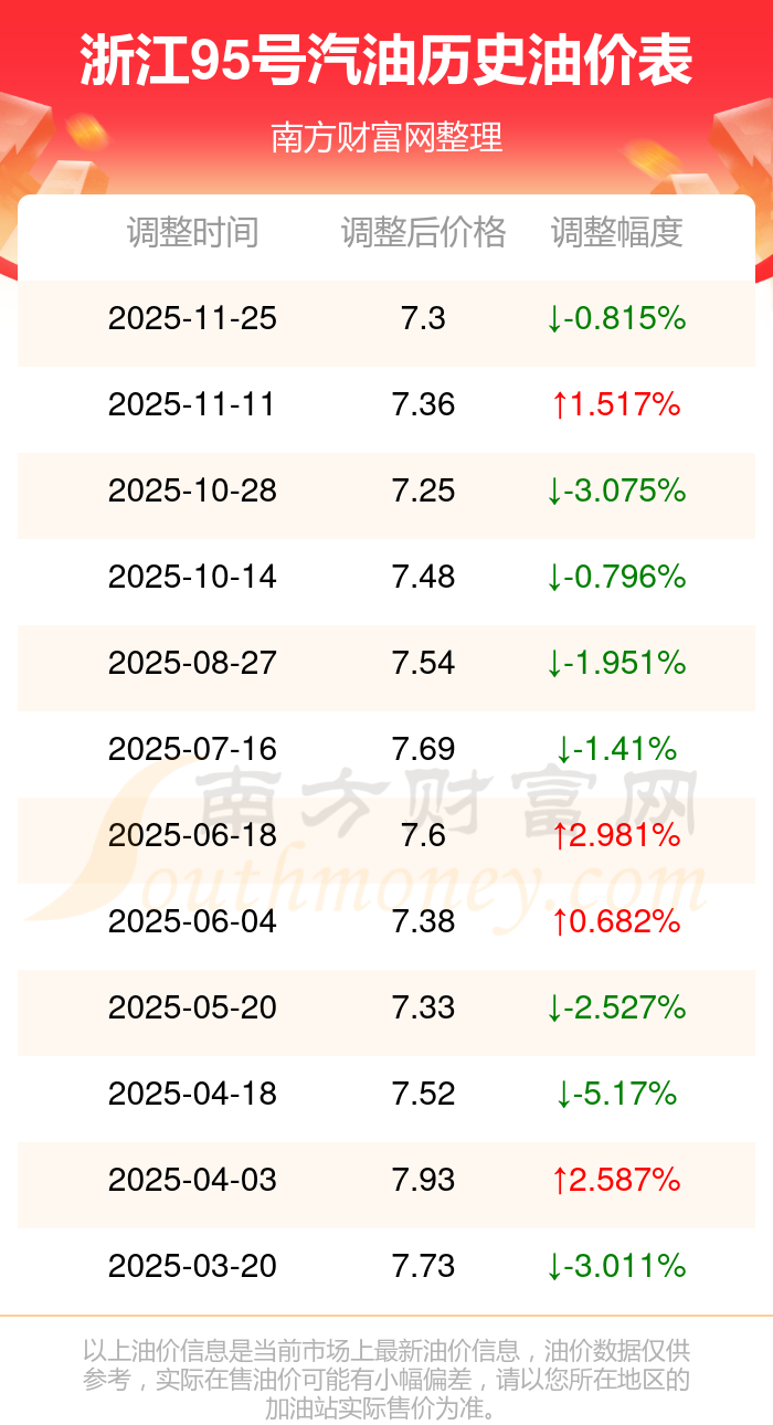 12月4日,浙江95号汽油的最新价格为7.3元/升,油价调整时间是11月25日,对比上一轮调整共下调了0.06元,下调0.815%。
