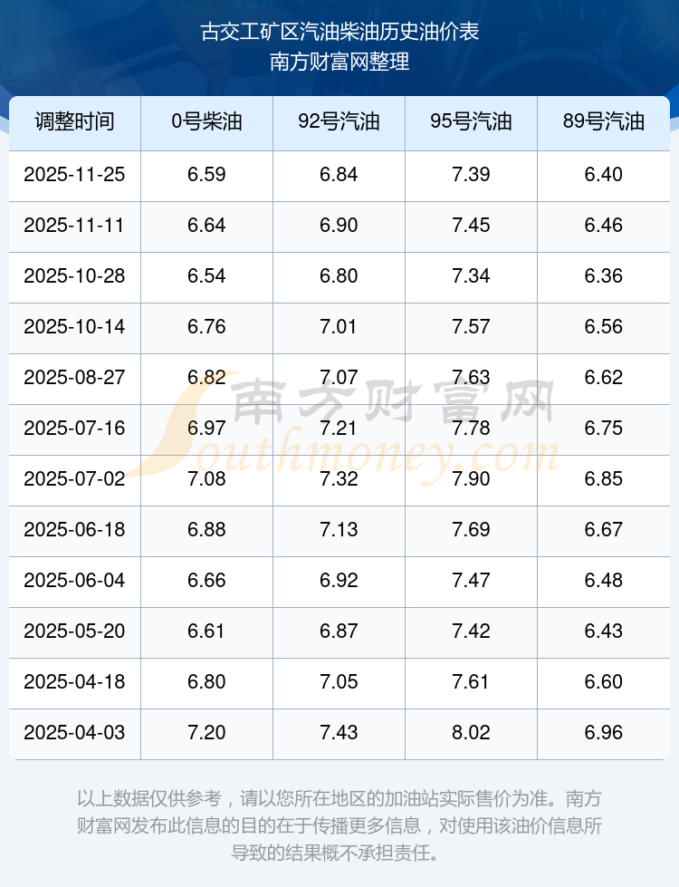 油价调整最新消息:下一轮油价调整时间12月8日24时。古交工矿区12月4日汽油价格详情:92号汽油6.84元;95号汽油7.39元;89号汽油6.4元;0号柴油6.59元(该价格为11月25日调整后的价格)。