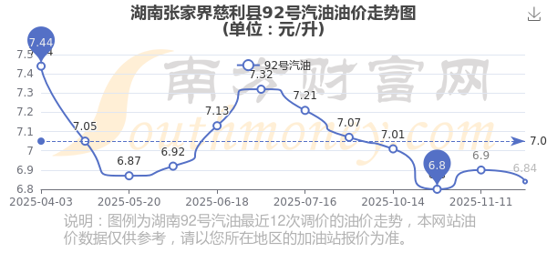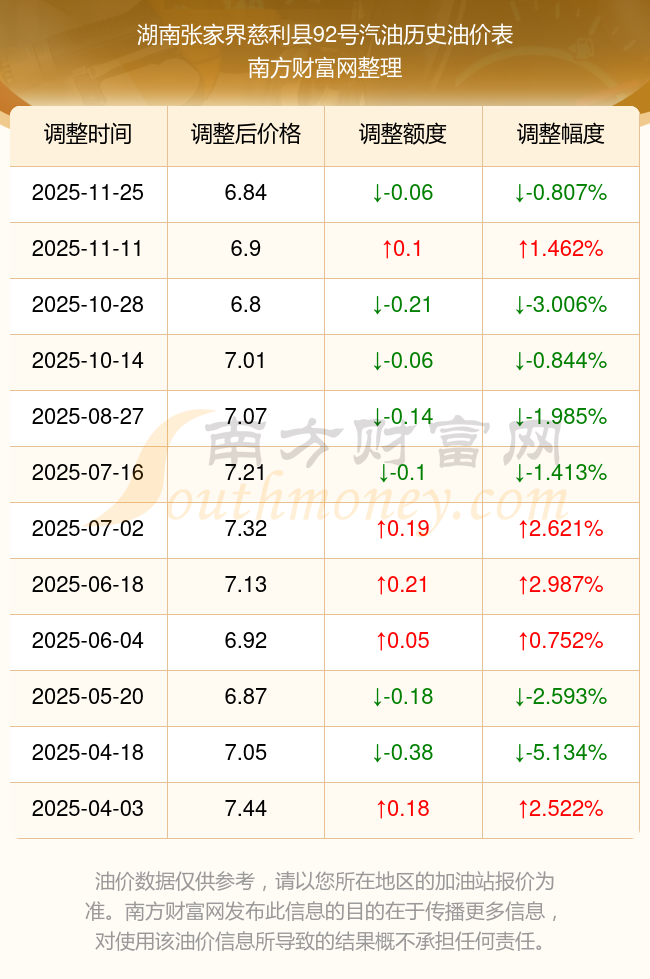 12月4日湖南张家界慈利县汽油、柴油每升的价格为:92号汽油为6.84元,减了0.06元;95号汽油为7.27元,减了0.06元;89号汽油为6.41元,减了0.05元;0号柴油为6.59元,减了0.06元,本轮油价的调整时间为11月25日。