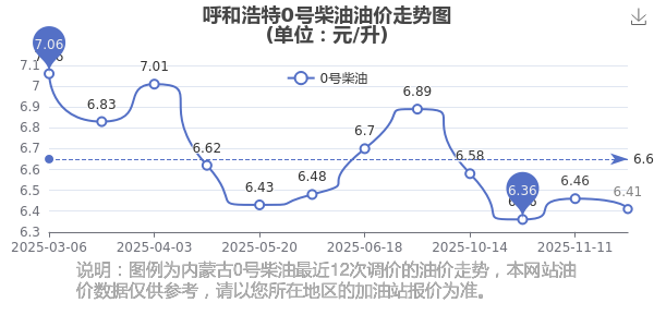12月4日呼和浩特汽油、柴油价格是多少钱一升?11月25日调整后,92号汽油为6.82元,减了0.06元,减幅达0.87%;95号汽油为7.28元,减了0.06元,减幅达0.82%;0号柴油为6.41元,减了0.05元,减幅达0.77%。呼和浩特下一轮油价调整时间12月8日24时,距离现在还有4.31天。