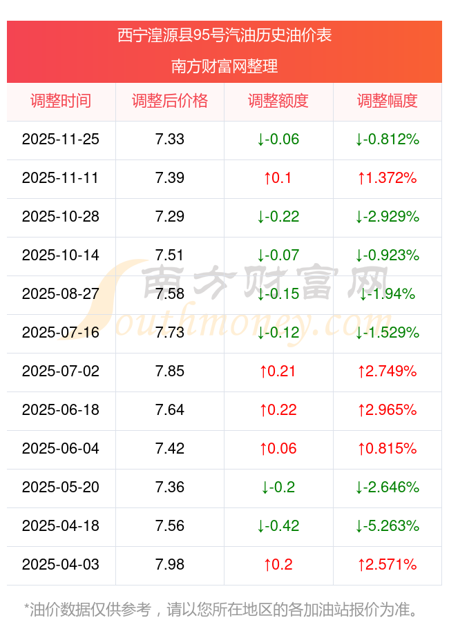 12月4日,西宁湟源县汽油、柴油每升最新价格:调整时间为11月25日,92号汽油为6.84元,降了0.06元,降幅达0.87%;95号汽油为7.33元,降了0.06元,降幅达0.81%;89号汽油为6.42元,降了0.05元,降幅达0.77%;0号柴油为6.46元,降了0.05元,降幅达0.77%。