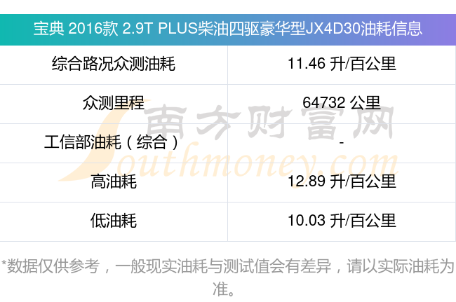 根据车主实测数据,该车型低油耗为10.03升/百公里,高油耗为12.89升/百公里,综合路况众测油耗为11.46升/百公里。
