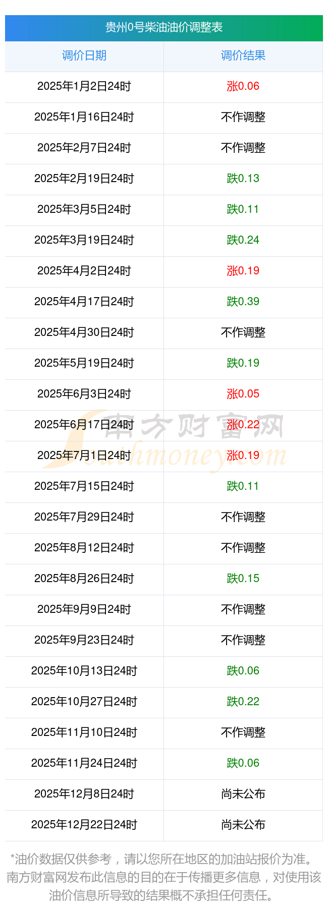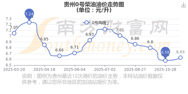 12月4日,贵州0号柴油的价格是6.63元每升,本次的调整时间为11月25日,对比上次的调整下调了0.06元,下调0.897%,12月8日24时为下一轮油价调整时间,还有4.31天。