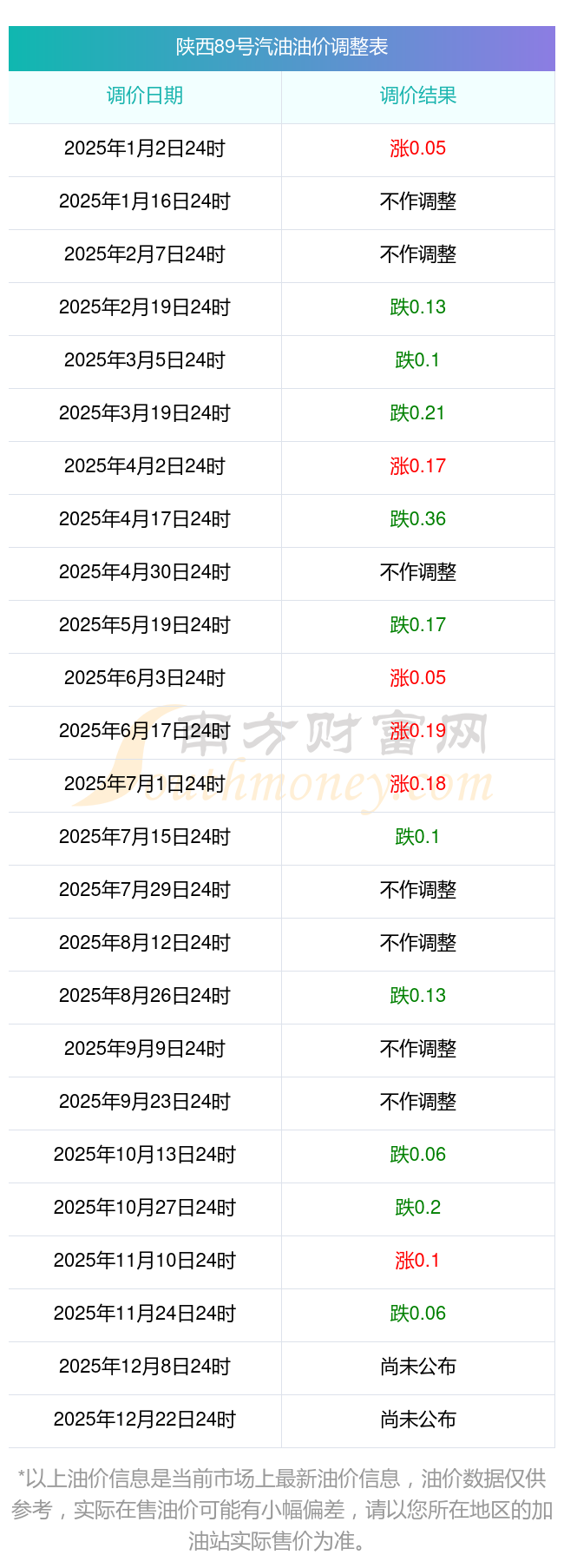 陕西彬州2025年油价调整时间及价格表