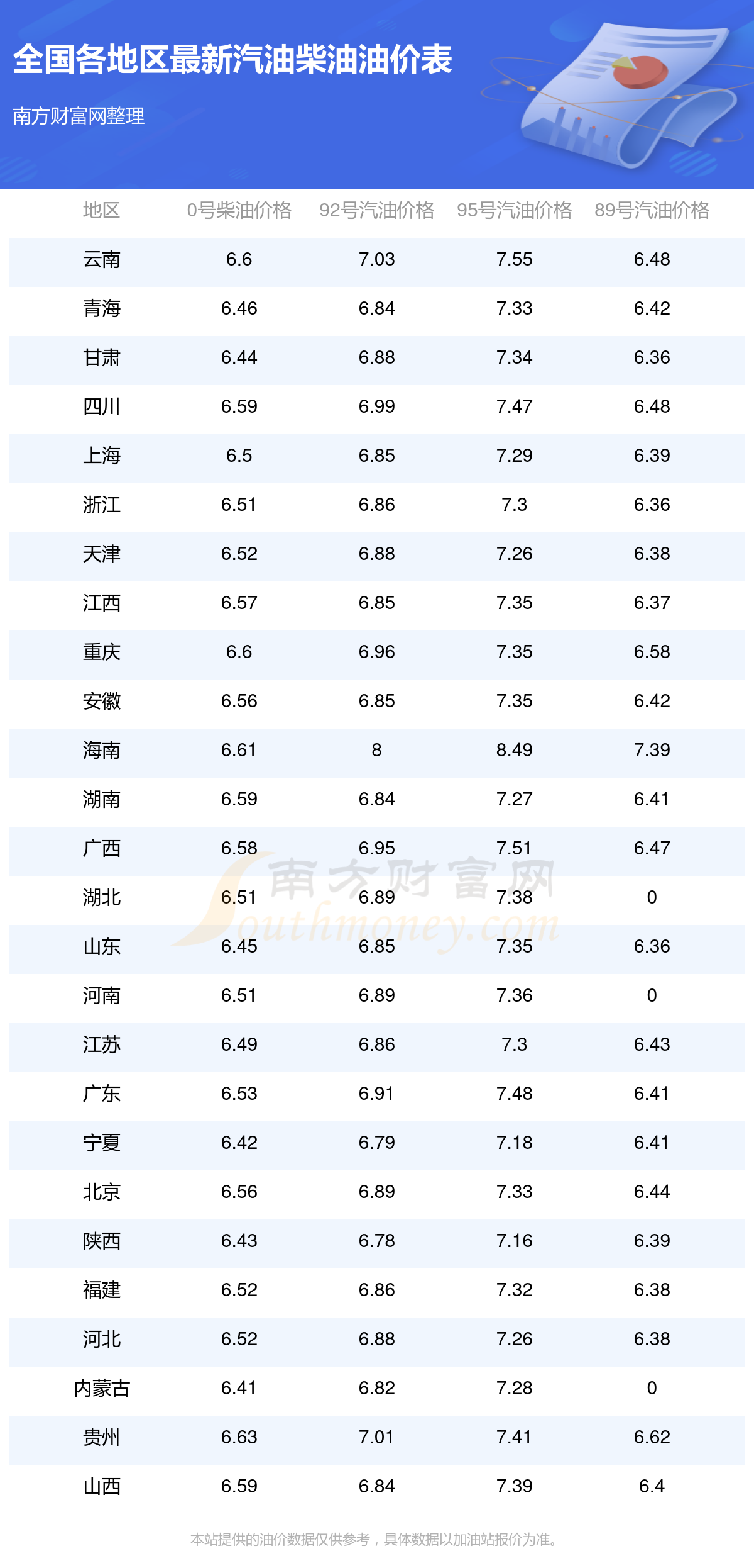 油价数据仅供参考,请以您所在地区的各加油站报价为准。