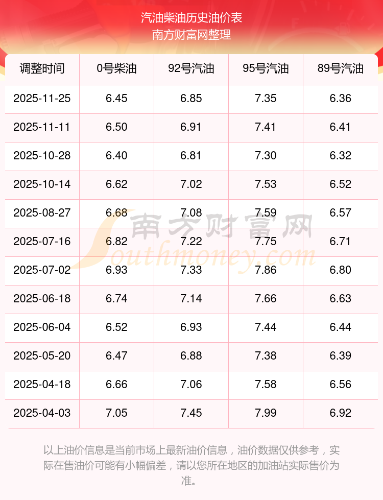 12月4日山东泰安汽油、柴油每升的价格为:92号汽油为6.85元,减了0.06元;95号汽油为7.35元,减了0.06元;89号汽油为6.36元,减了0.05元;0号柴油为6.45元,减了0.05元,本轮油价的调整时间为11月25日。下一轮油价调整时间12月8日24时,距离现在还有4.3天。