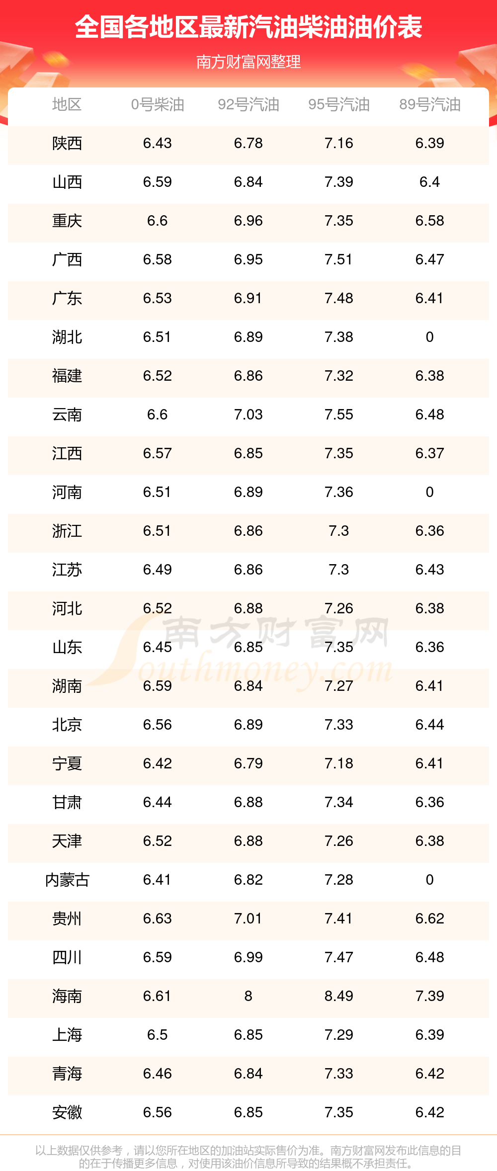 以上数据仅供参考,请以您所在地区的加油站实际售价为准。南方财富网发布此信息的目的在于传播更多信息,对使用该油价信息所导致的结果概不承担责任。