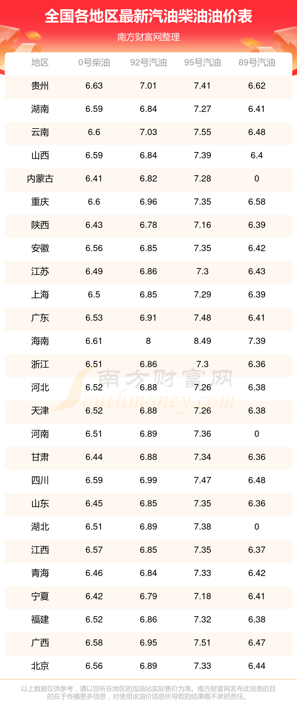 油价数据仅供参考,请以您所在地区的加油站报价为准。南方财富网发布此信息的目的在于传播更多信息,对使用该油价信息所导致的结果概不承担任何责任。