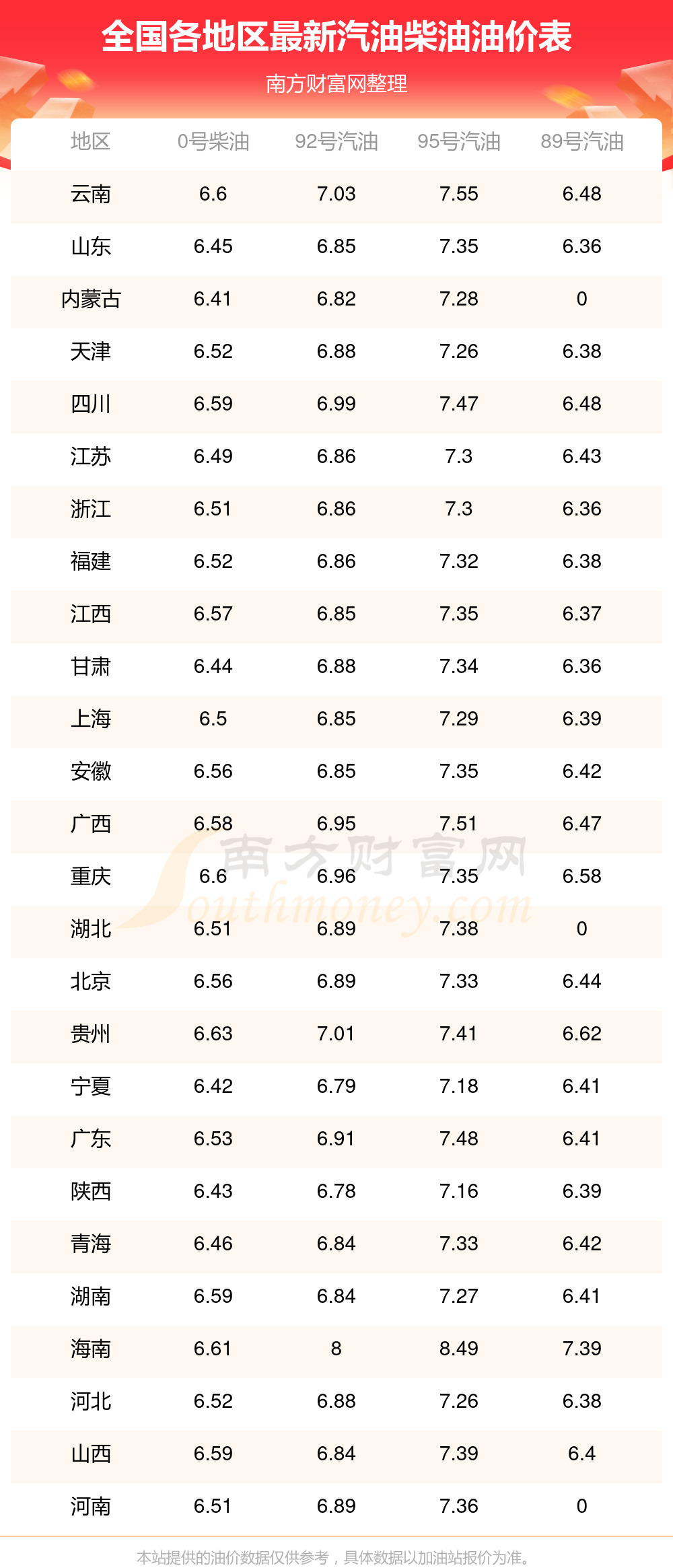 本轮油价调整时间为11月25日 ,调整后全国的油价具体为:
