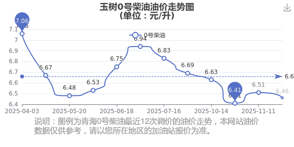 玉树0号柴油12月4日的价格为11月25日调整后的价格,具体为6.46元/升,相对上次调整下跌了0.05元。