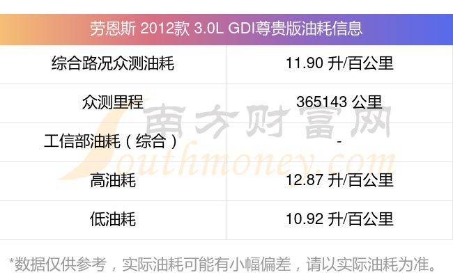 根据多位车主实测得出数据,该车型低油耗为10.92L/100km,高油耗为12.87L/100km,综合路况众测油耗为11.90L/100km,工信部综合油耗为-L/100km。