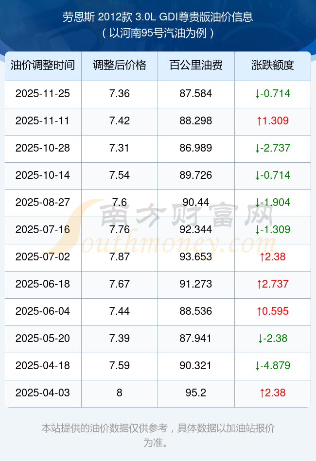 按11月25日95号汽油最新调整价格7.36元每升来计算(以河南为例),该车型百公里平均油费为87.584元,按上一轮11月11日调整价格7.42元每升来计算,百公里平均油费为88.298元,对比上一轮少花0.714元,下一轮油价调整时间为12月8日24时。