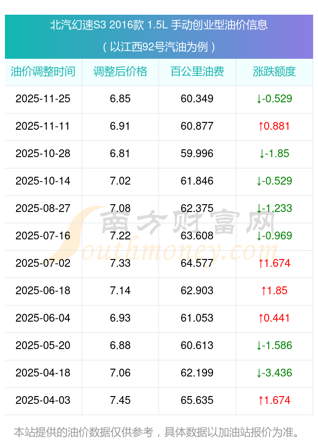 依照11月25日92号汽油最新调整价格6.85元/升来计算(以江西为例),该车型百公里的平均油费是60.349元,依照上一轮11月11日调整价格6.91元/升来计算,百公里的平均油费是60.877元,对比上一轮少花0.529元,下一轮的油价调整时间12月8日24时。