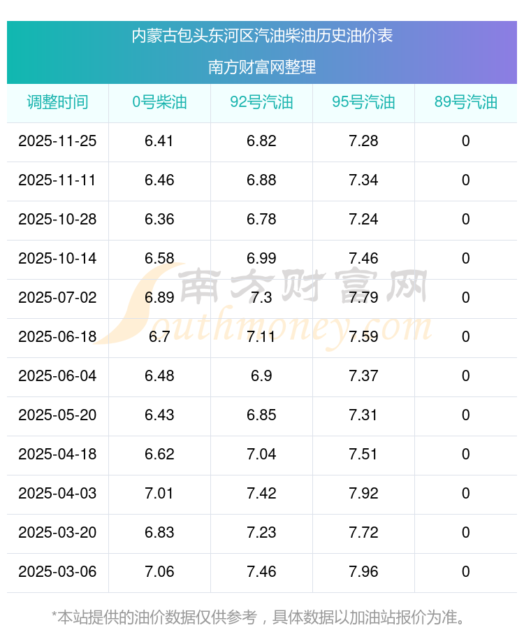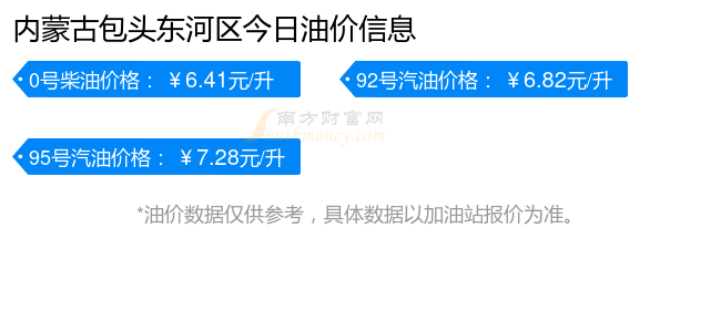 12月4日,内蒙古包头东河区汽油、柴油每升最新价格为:92号汽油为6.82元,下跌了0.06元;95号汽油为7.28元,下跌了0.06元;0号柴油为6.41元,下跌了0.05元,调整时间为11月25日。