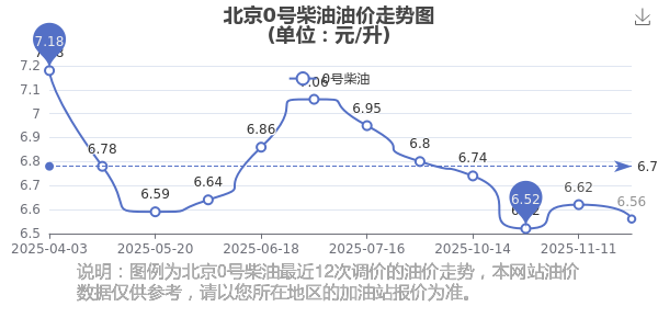 12月4日北京汽油、柴油价格是11月25日调整后的价格,每升价格具体为:92号汽油为6.89元,下降了0.05元,下降幅达0.72%;95号汽油为7.33元,下降了0.06元,下降幅达0.81%;89号汽油为6.44元,下降了0.06元,下降幅达0.92%;0号柴油为6.56元,下降了0.06元,下降幅达0.91%。北京下一轮油价调整时间12月8日24时,距离现在还有4.26天。