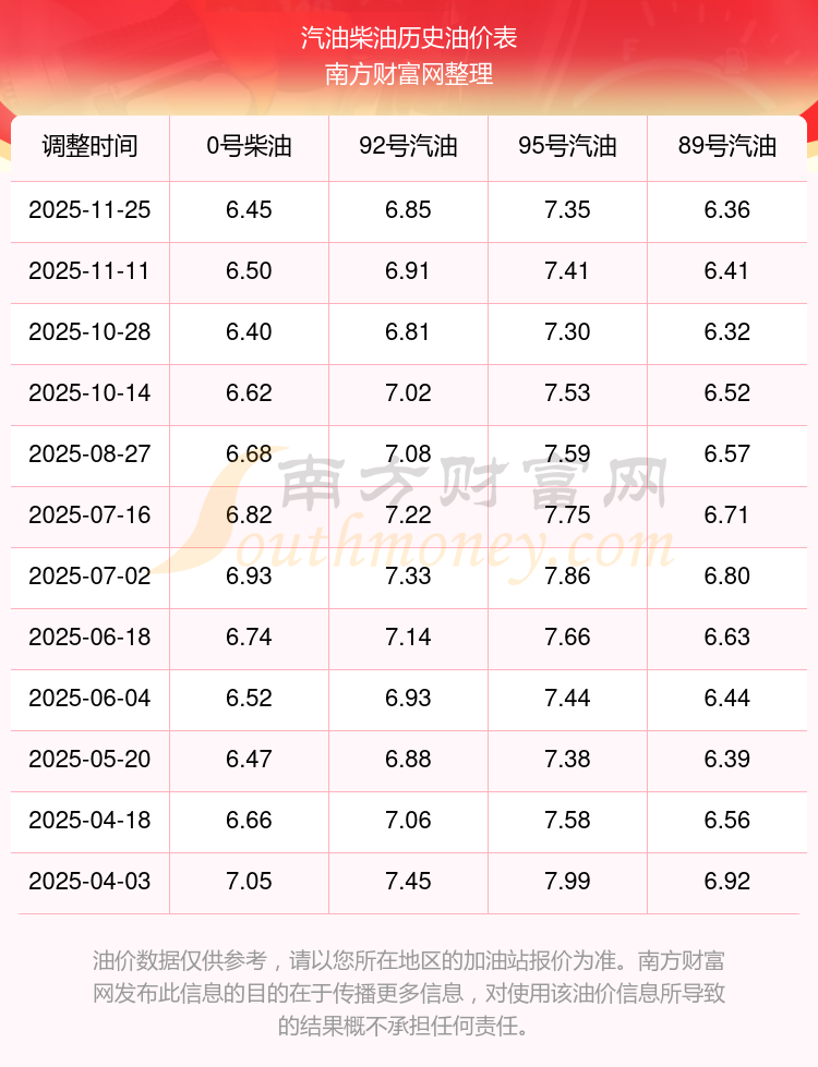 12月4日莱芜95号汽油的价格是7.35元/升(油价调整时间11月25日),相对上一轮油价调整时间11月11日的价格7.41元/升,下降了0.06元,下降幅达0.81%。下一轮油价调整时间12月8日24时,距离现在还有4.25天。