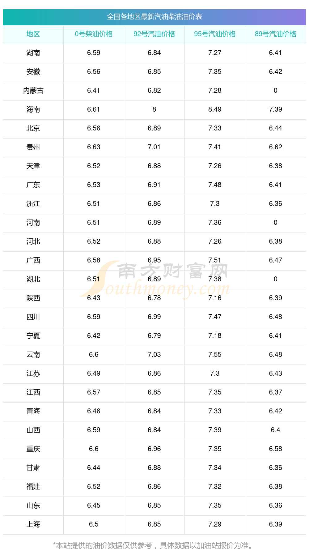 以上数据仅供参考,请以您所在地区的加油站实际售价为准。南方财富网发布此信息的目的在于传播更多信息,对使用该油价信息所导致的结果概不承担责任。