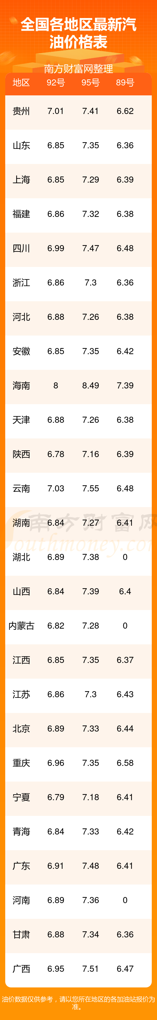 2025年12月4日全国各地汽油价格一览表