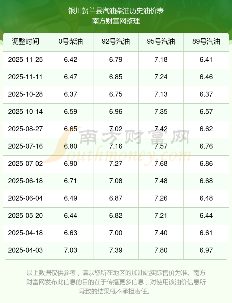 银川贺兰县汽油柴油12月4日的价格每升多少钱?具体为:92号汽油为6.79元,减了0.06元;95号汽油为7.18元,减了0.06元;89号汽油为6.41元,减了0.05元;0号柴油为6.42元,减了0.05元,本轮油价的调整时间为11月25日。