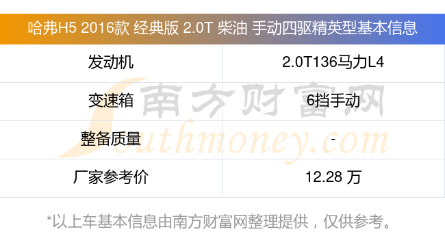 在动力方面,哈弗H5 2016款 经典版 2.0T 柴油 手动四驱精英型搭载的是一台2.0T136马力L4涡轮增压发动机,匹配6挡手动挡变速箱,燃料形式为柴油,厂家参考价12.28万元。