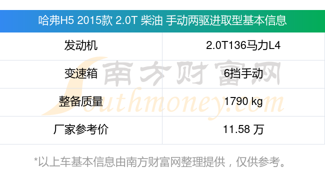 哈弗H5 2015款 2.0T 柴油 手动两驱进取型动力上配备的是一台2.0T136马力L4涡轮增压发动机,匹配的是6挡手动挡变速箱,燃料形式为柴油,常规整备质量1790kg,厂家参考价11.58万元。