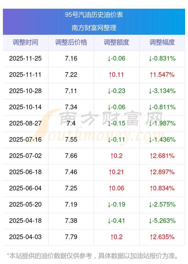 12月4日,汽油、柴油每升的价格是多少?本次油价调整时间是11月25日,92号汽油为6.78元,跌了0.05元,跌幅达0.73%;95号汽油为7.16元,跌了0.06元,跌幅达0.83%;89号汽油为6.39元,跌了0.06元,跌幅达0.93%;0号柴油为6.43元,跌了0.05元,跌幅达0.77%。下一轮油价调整时间12月8日24时,距离现在还有4.24天。