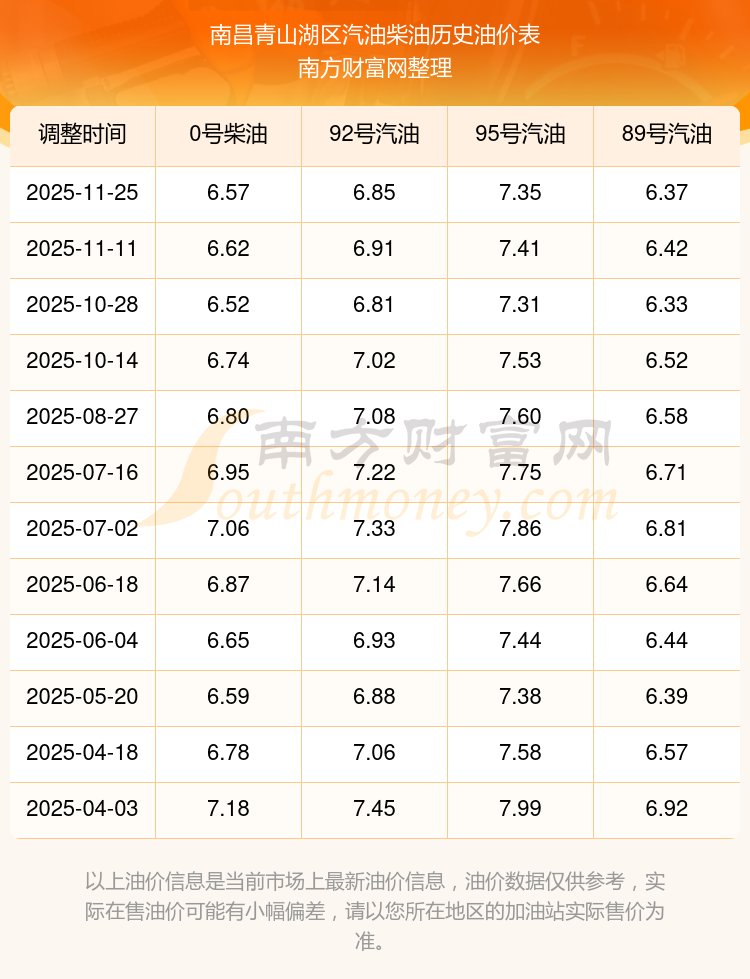 油价调整最新消息:下一轮油价调整时间12月8日24时。12月4日南昌青山湖区汽油、柴油价格是多少钱一升?11月25日调整后,92号汽油为6.85元,降了0.06元,降幅达0.87%;95号汽油为7.35元,降了0.06元,降幅达0.81%;89号汽油为6.37元,降了0.05元,降幅达0.78%;0号柴油为6.57元,降了0.05元,降幅达0.76%。