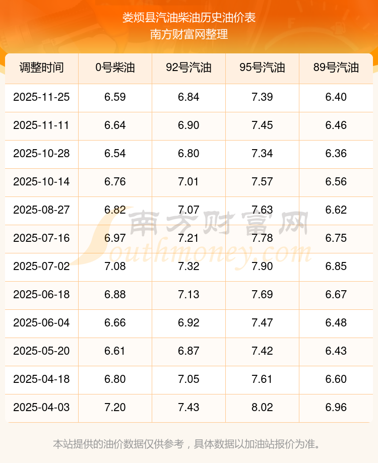 油价调整最新消息:下一轮油价调整时间12月8日24时。12月4日娄烦县汽油、柴油每升的价格为:92号汽油为6.84元,跌了0.06元;95号汽油为7.39元,跌了0.06元;89号汽油为6.4元,跌了0.06元;0号柴油为6.59元,跌了0.05元,本轮油价的调整时间为11月25日。