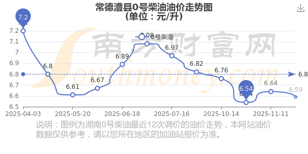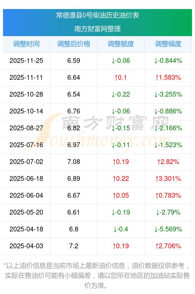 12月4日常德澧县0号柴油的最新价格:常德澧县0号柴油6.59元/升(根据11月25日调整后的价格),相对上次调整时间11月11日的油价6.64元每升,下调了0.06元,下调0.844%。