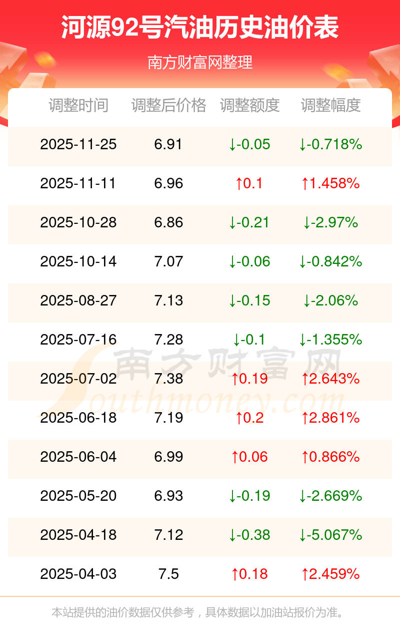 12月4日河源92号汽油的价格为6.91元/升,本轮油价的调整时间为11月25日,相对上一轮油价调整时间11月11日的价格6.96元/升,下跌了0.05元,下跌幅达0.718%。下一轮油价调整时间12月8日24时,距离现在还有4.22天。
