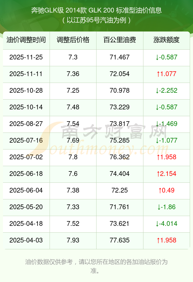 依照11月25日95号汽油最新调整价格7.3元/升来计算(以江苏为例),该车型百公里的平均油费是71.467元,依照上一轮11月11日调整价格7.36元/升来计算,百公里的平均油费是72.054元,对比上一轮少花0.587元,下一轮的油价调整时间12月8日24时。