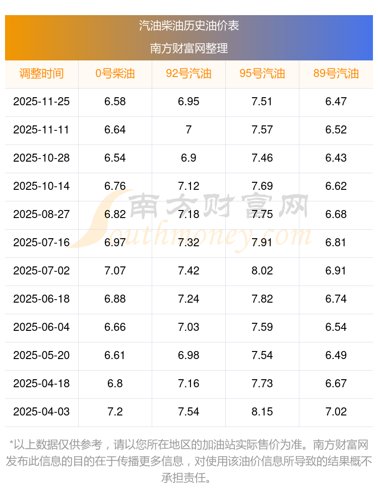 2025年92号汽油价格一览表