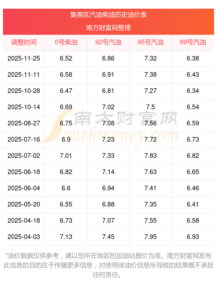 油价数据仅供参考,请以您所在地区的加油站报价为准。南方财富网发布此信息的目的在于传播更多信息,对使用该油价信息所导致的结果概不承担任何责任。