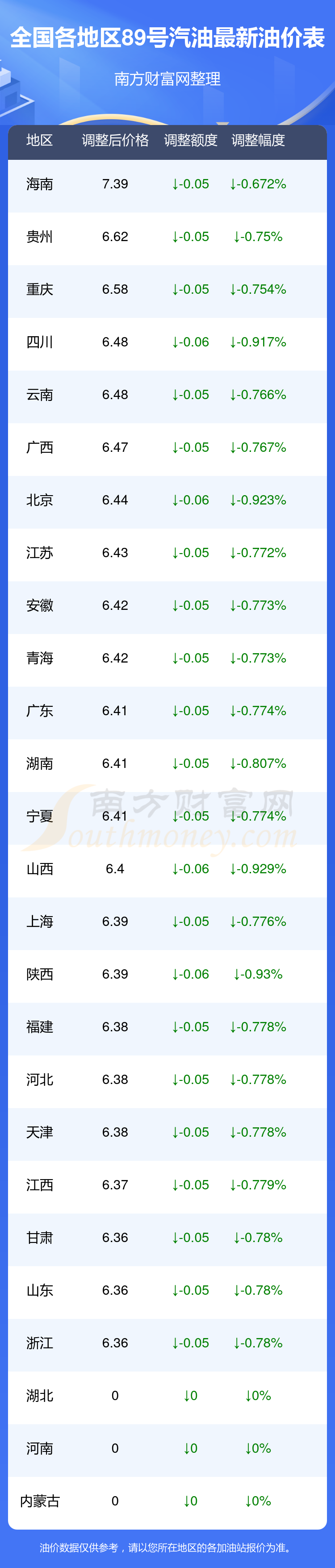 油价数据仅供参考,请以您所在地区的加油站报价为准。南方财富网发布此信息的目的在于传播更多信息,对使用该油价信息所导致的结果概不承担任何责任。