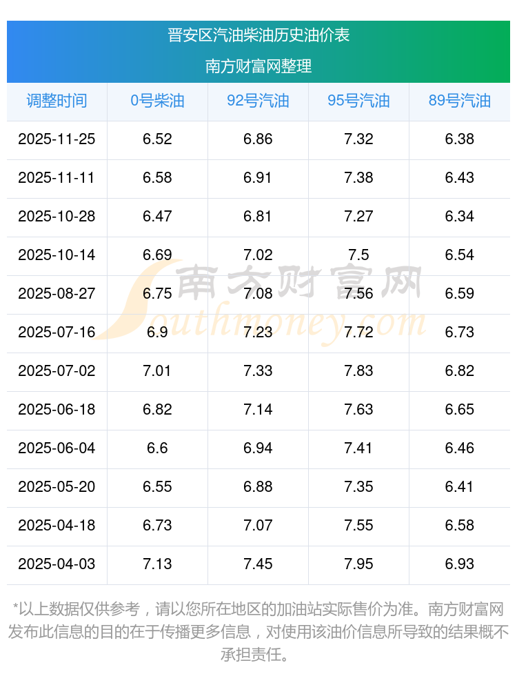 油价数据仅供参考,请以您所在地区的加油站报价为准。南方财富网发布此信息的目的在于传播更多信息,对使用该油价信息所导致的结果概不承担任何责任。