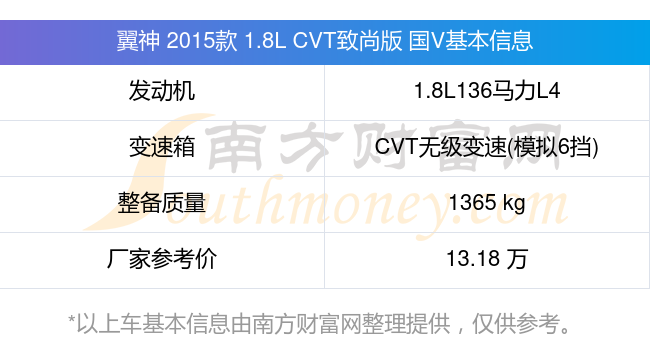 翼神 2015款 1.8L CVT致尚版 国V动力上配备的是一台1.8L136马力L4自然吸气发动机,匹配的是CVT无级变速(模拟6挡)自动档变速箱,燃料形式为汽油,常规整备质量1365kg,厂家参考价13.18万元。