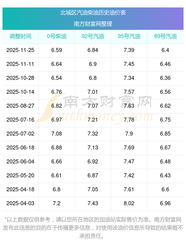 以上数据仅供参考,请以您所在地区的加油站实际售价为准。南方财富网发布此信息的目的在于传播更多信息,对使用该油价信息所导致的结果概不承担责任。