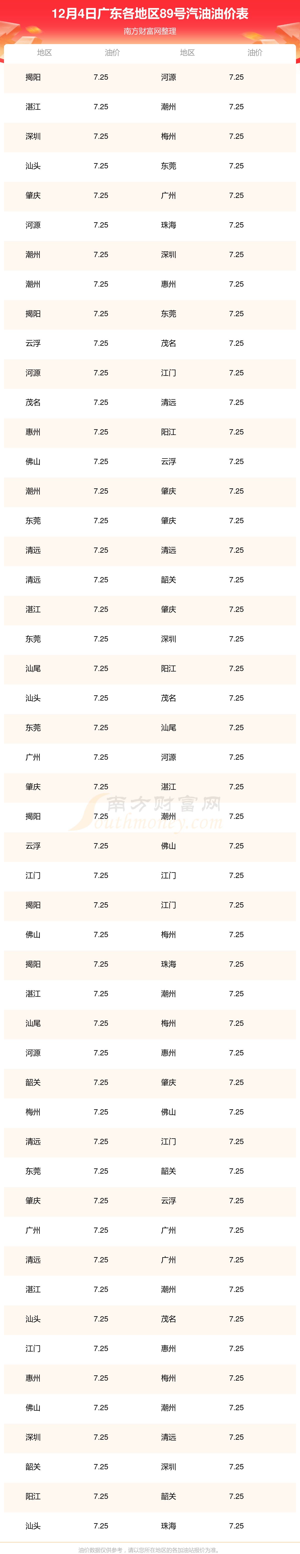 广东各地区最新89号汽油油价表