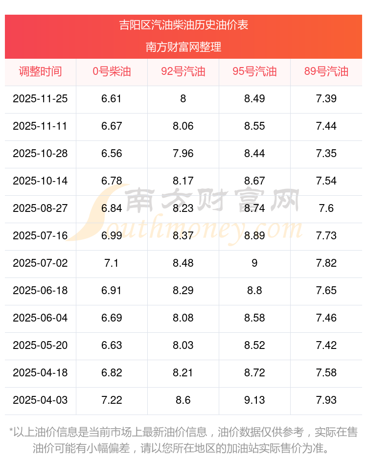 油价调整最新消息:下一轮油价调整时间12月8日24时。吉阳区汽油、柴油12月4日每升最新价格为:92号汽油为8元;95号汽油为8.49元;89号汽油为7.39元;0号柴油为6.61元,调整时间为11月25日。