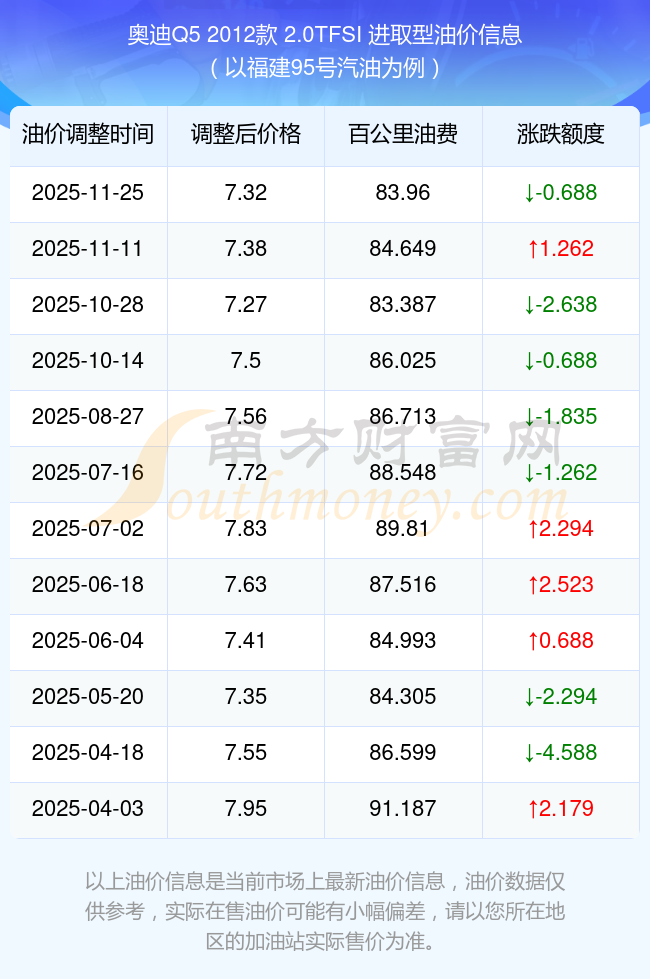 根据11月25日95号汽油最新调整价格7.32元/升来计算(以福建为例),该车型每百公里的平均油费是83.96元,上一轮11月11日调整价格7.38元每升来计算,每百公里的平均油费是84.649元,对比上一轮少花0.688元,下一轮的油价调整时间是12月8日24时。