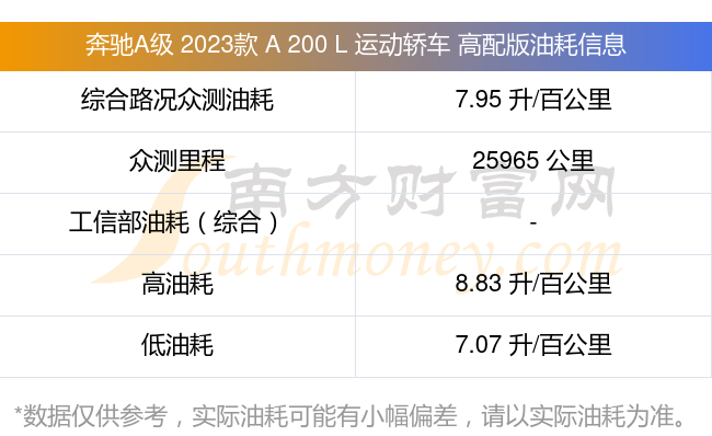 根据车主实测数据,该车型低油耗为7.07L/100km,高油耗为8.83L/100km,综合路况众测油耗为7.95L/100km,工信部综合油耗为-L/100km。