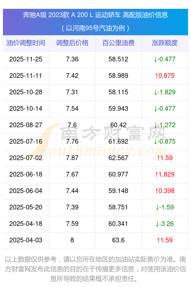 按11月25日95号汽油最新调整价格7.36元每升来计算(以河南为例),该车型百公里平均油费为58.512元,按上一轮11月11日调整价格7.42元每升来计算,百公里平均油费为58.989元,对比上一轮少花0.477元,下一轮油价调整时间为12月8日24时。