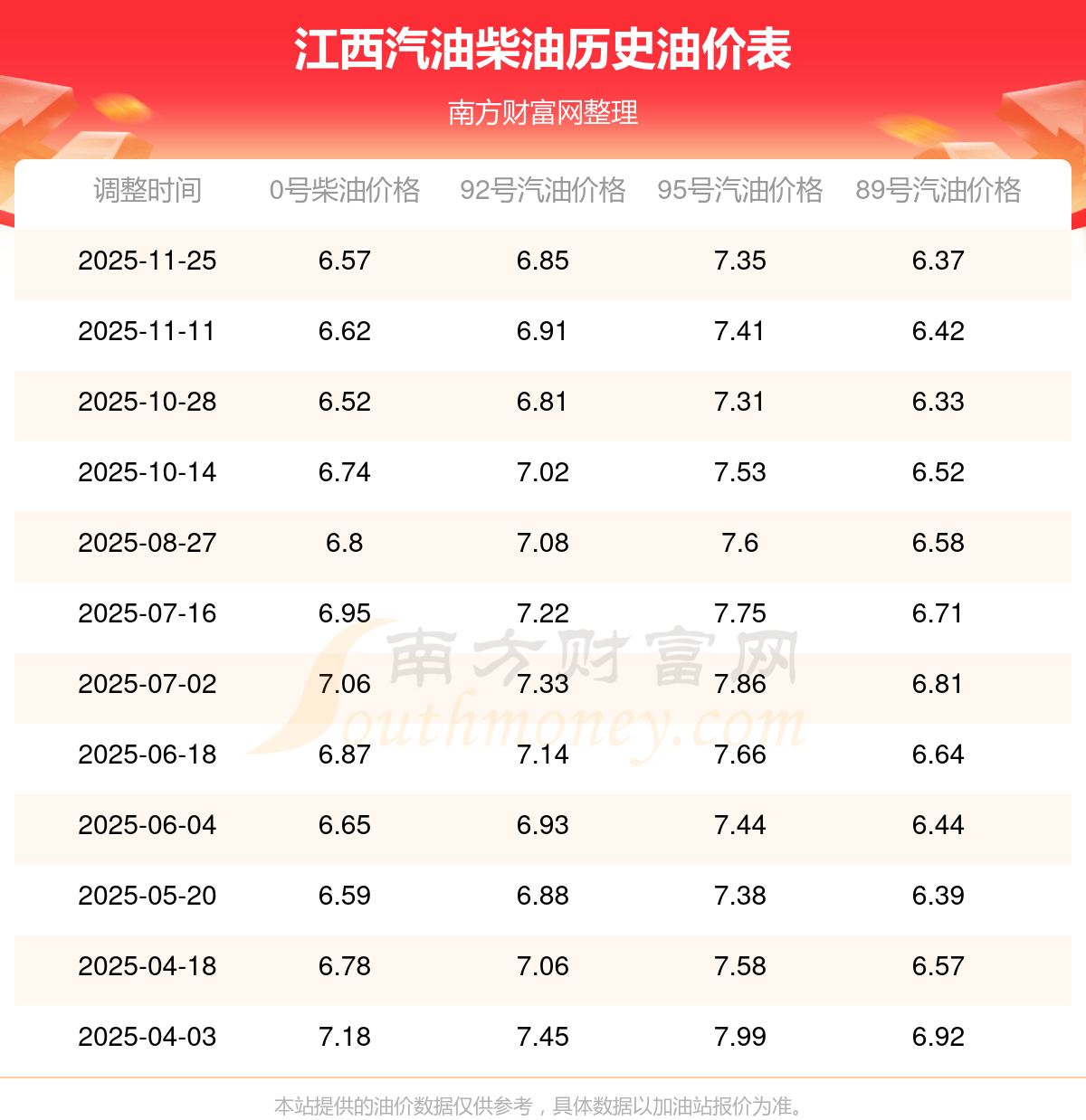 油价数据仅供参考,请以您所在地区的加油站报价为准。南方财富网发布此信息的目的在于传播更多信息,对使用该油价信息所导致的结果概不承担任何责任。