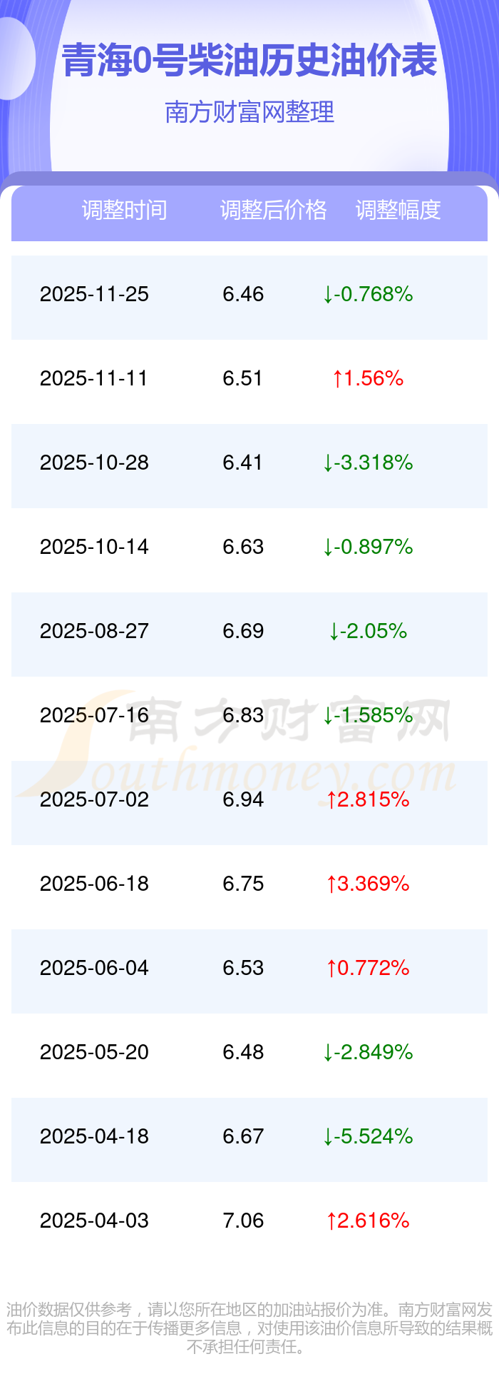 12月4日,青海0号柴油的价格是6.46元每升,本次的调整时间为11月25日,对比上次的调整下调了0.05元,下调0.768%,12月8日24时为下一轮油价调整时间,还有4.17天。