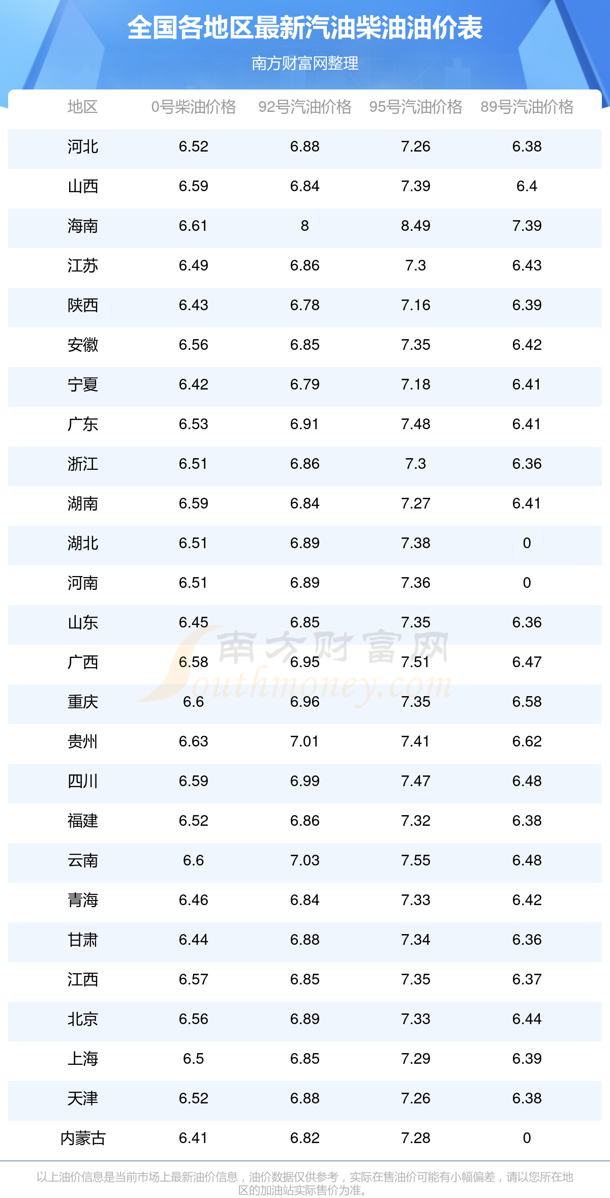 油价数据仅供参考,请以您所在地区的加油站报价为准。南方财富网发布此信息的目的在于传播更多信息,对使用该油价信息所导致的结果概不承担任何责任。