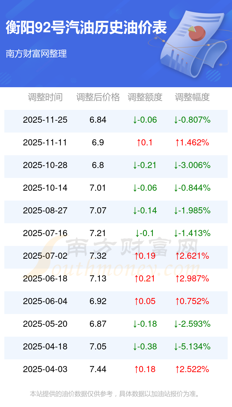 衡阳92号汽油12月4日最新价格为6.84元每升,本轮油价调整时间为11月25日,相对上次调整时间11月11日的油价6.9元每升,共下降了0.06元,下降0.807%。下一轮油价调整时间12月8日24时,距离现在还有4.16天。