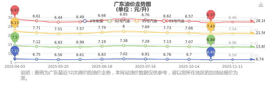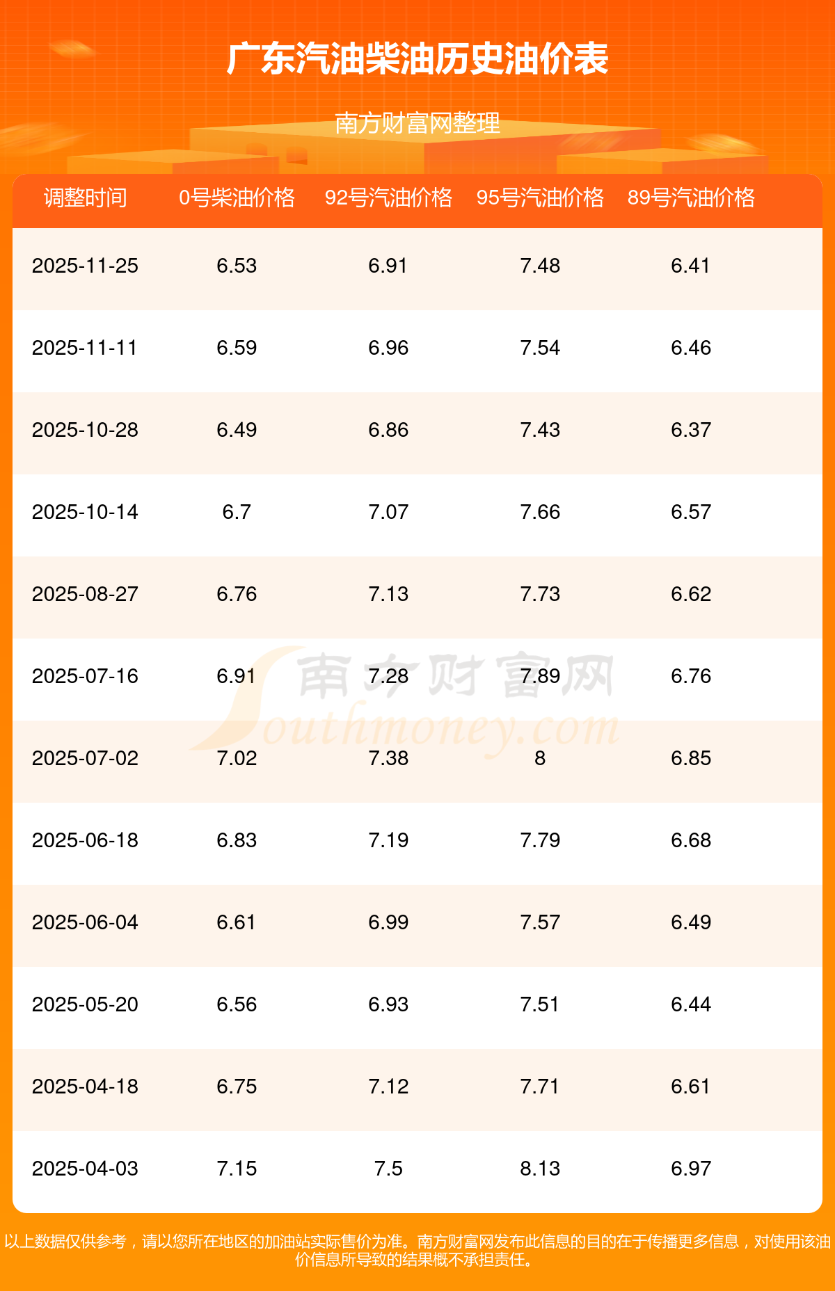 广东汽油、柴油12月4日每升的价格是多少?具体为:92号汽油为6.91元;95号汽油为7.48元;89号汽油为6.41元,跌了0.05;0号柴油为6.53元,本轮调整时间为11月25日。