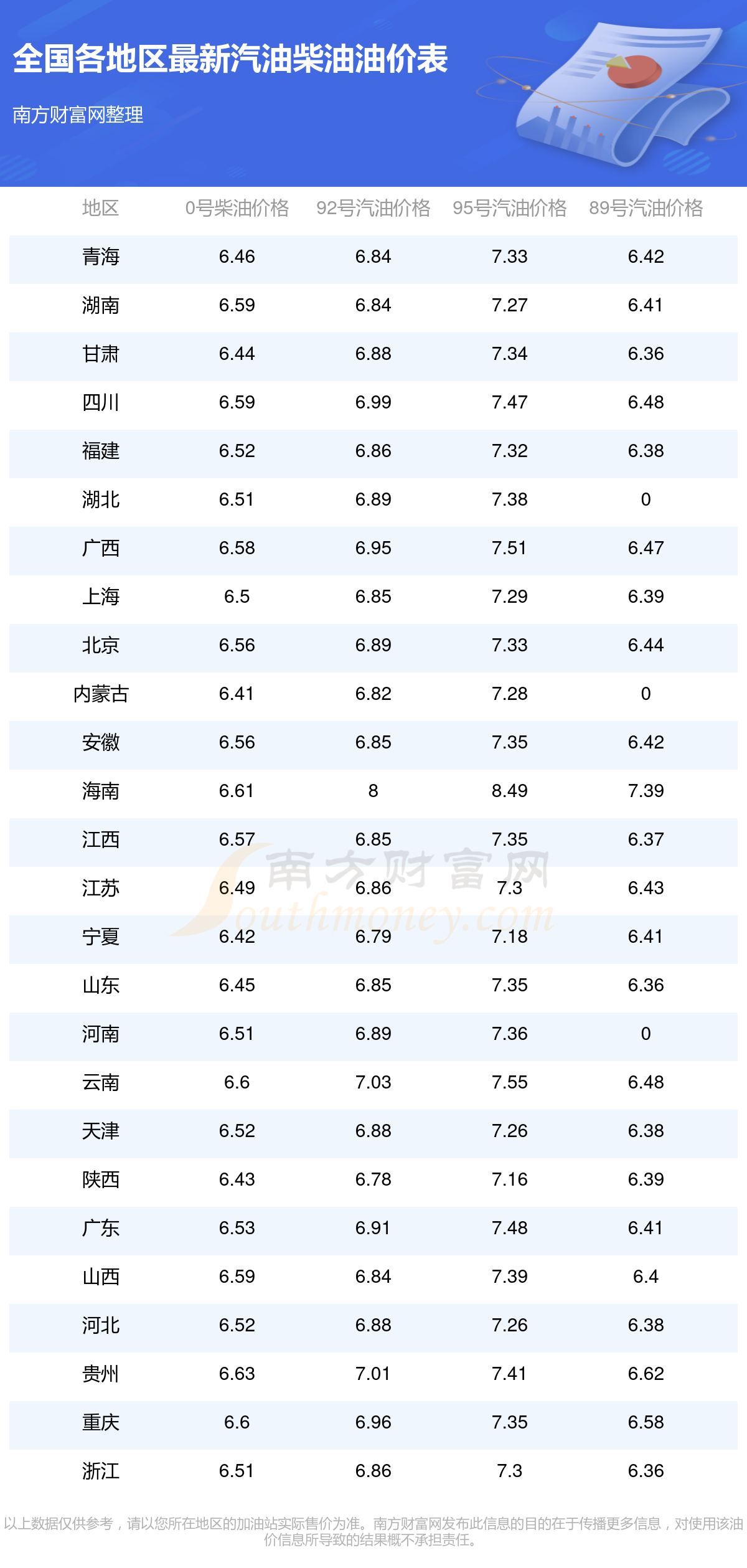 油价数据仅供参考,请以您所在地区的加油站报价为准。南方财富网发布此信息的目的在于传播更多信息,对使用该油价信息所导致的结果概不承担任何责任。