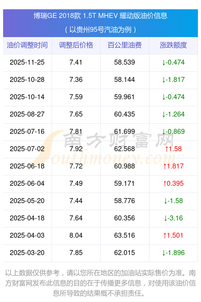 根据11月25日95号汽油最新调整价格7.41元/升来计算(以贵州为例),该车型每百公里的平均油费是58.539元,上一轮10月28日调整价格7.47元每升来计算,每百公里的平均油费是59.013元,对比上一轮少花0.474元,下一轮的油价调整时间是12月8日24时。