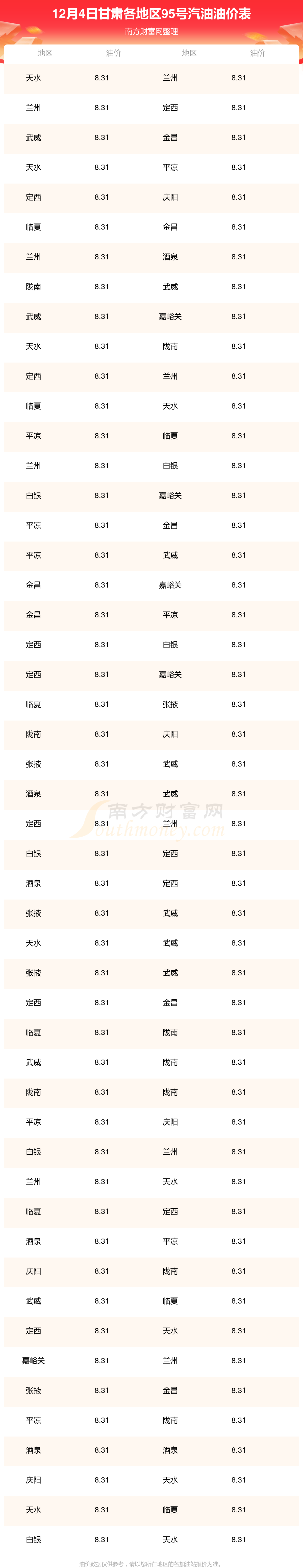 12月4日,甘肃95号汽油油价是7.34元每升,本次油价格调整时间为11月25日,上次调整时间为11月11日,甘肃95号汽油7.4元每升,本次对比跌了0.06元。